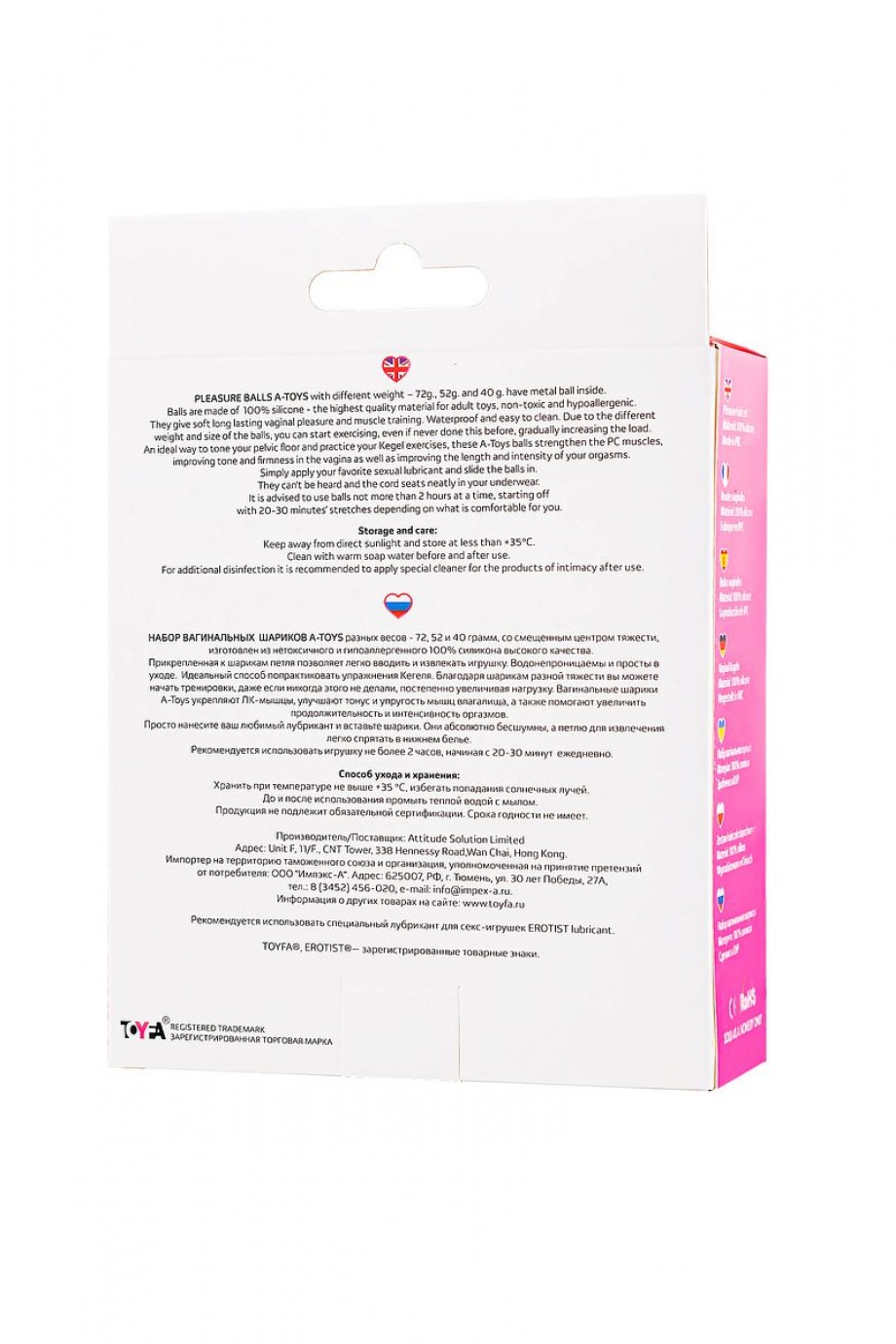 Набор вагинальных шариков A-Toys со смещенным центром тяжести выполнен из нетоксичного и гипоаллергенного 100% силикона высокого качества. На конце есть петля, позволяющая легко вводить и извлекать игрушку. Водонепроницаемы и просты в уходе. Идеальный способ попрактиковать упражнения Кегеля. Благодаря шарикам разной тяжести вы можете начать тренировки, даже если никогда этого не делали, постепенно увеличивая нагрузку. Вагинальные шарики А-Toys укрепляют ЛК-мышцы, улучшают тонус и упругость мышц влагалища, а также помогают увеличить продолжительность и интенсивность оргазмов. Просто нанесите ваш любимый лубрикант и вставьте шарики. Они абсолютно бесшумны, а петлю для извлечения легко спрятать в нижнем белье. Рекомендуется использовать игрушку не более 2 часов, начиная с 20-30 минут ежедневно. Размеры: длина - 16,5 см., диаметр - 3,2 см., вес 72гр. длина - 15,5 см, диаметр - 3 см, вес-52 гр. длина - 12 см., диаметр - 3,6 см., вес-40гр Информация о технических характеристиках, комплекте поставки, стране изготовления и внешнем виде товара носит справочный характер и основывается на последних доступных сведениях от официальных поставщиков.